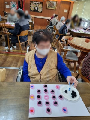- 어르신들께 병뚜껑에 공올리기 인지활동 프로그램을 진행하였습니다.